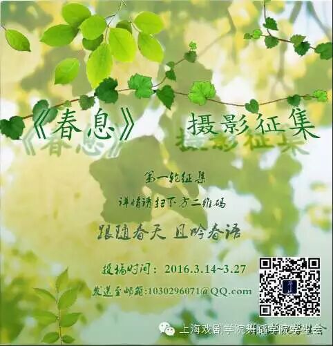 2016年的春天上海戏剧学院舞蹈学院第二季度倾情打造“春息”系列之摄影征集活动(摄影作品内容不限形式,能体现“春息”主旨皆可)。无论是潺潺的溪流还是萌苗的嫩芽都可以拍下来和大家一起分享,就让同学们为上戏代言,为春天代言!凡是参与者都会有小礼品赠送,同时评选出大家心目中优秀的摄影作品。