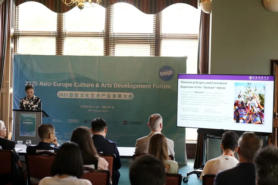 8月10日,由上戏联合中欧国际文化创新中心、英国全球青年人才基金会等机构主办的“2025亚欧文化艺术产业发展大会”在爱丁堡圣伦纳德大厅举行。来自中国、英国、法国、德国、意大利等20多个国家的近百位代表围绕文化艺术国际交流与未来发展、亚欧国际文化交流市场机制、跨文化艺术发展趋势等核心议题展开深入探讨,舞蹈学院副院长周蓓教授做了主题发言,制作人邹蕊和青年演员董涵进行了现场展示。