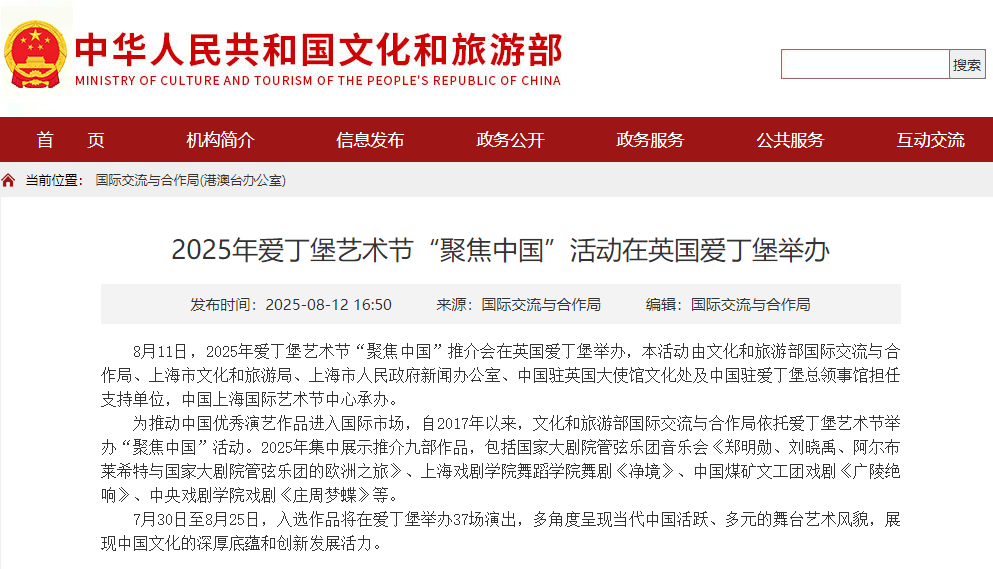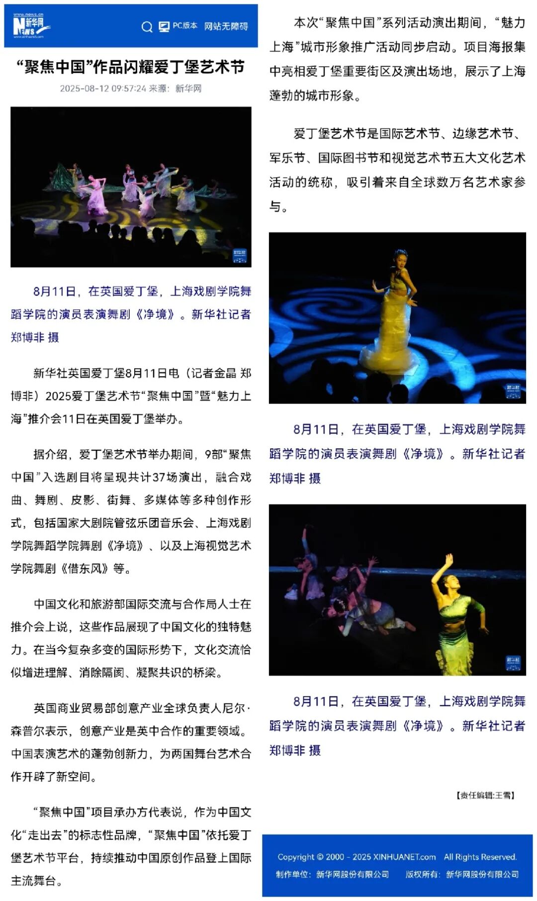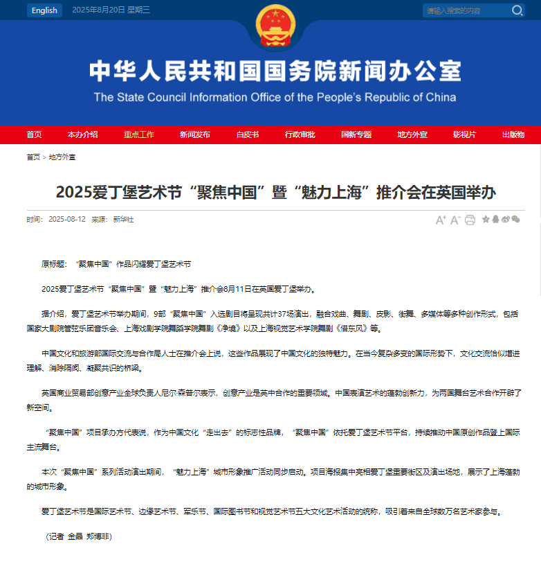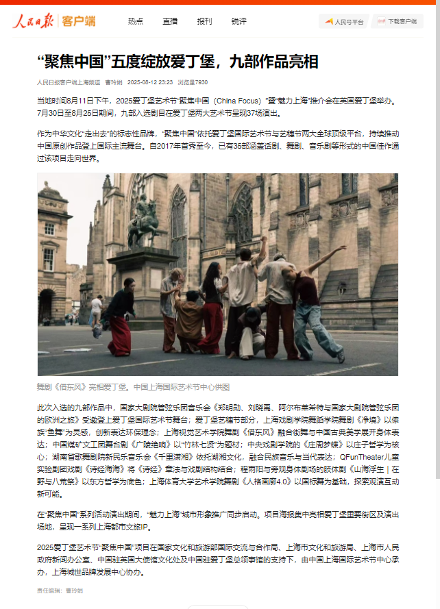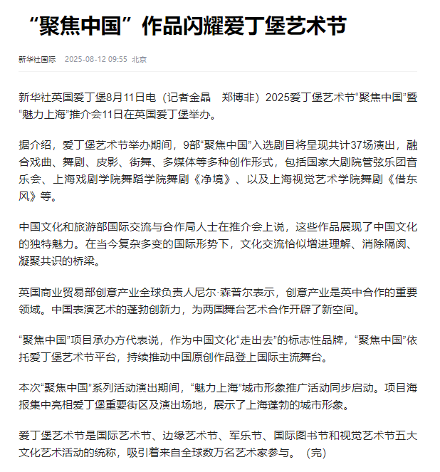 英国主流媒体《The List》《Lothian Life Magazine》等给予该剧四星评价,成功展示了中华传统文化与海派艺术风格的独特魅力。国务院新闻办公室、文化和旅游部、人民日报、新华社国际、新华网、东方卫视、凤凰卫视等多家媒体对此次“聚焦中国”展演项目进行了专题报道。