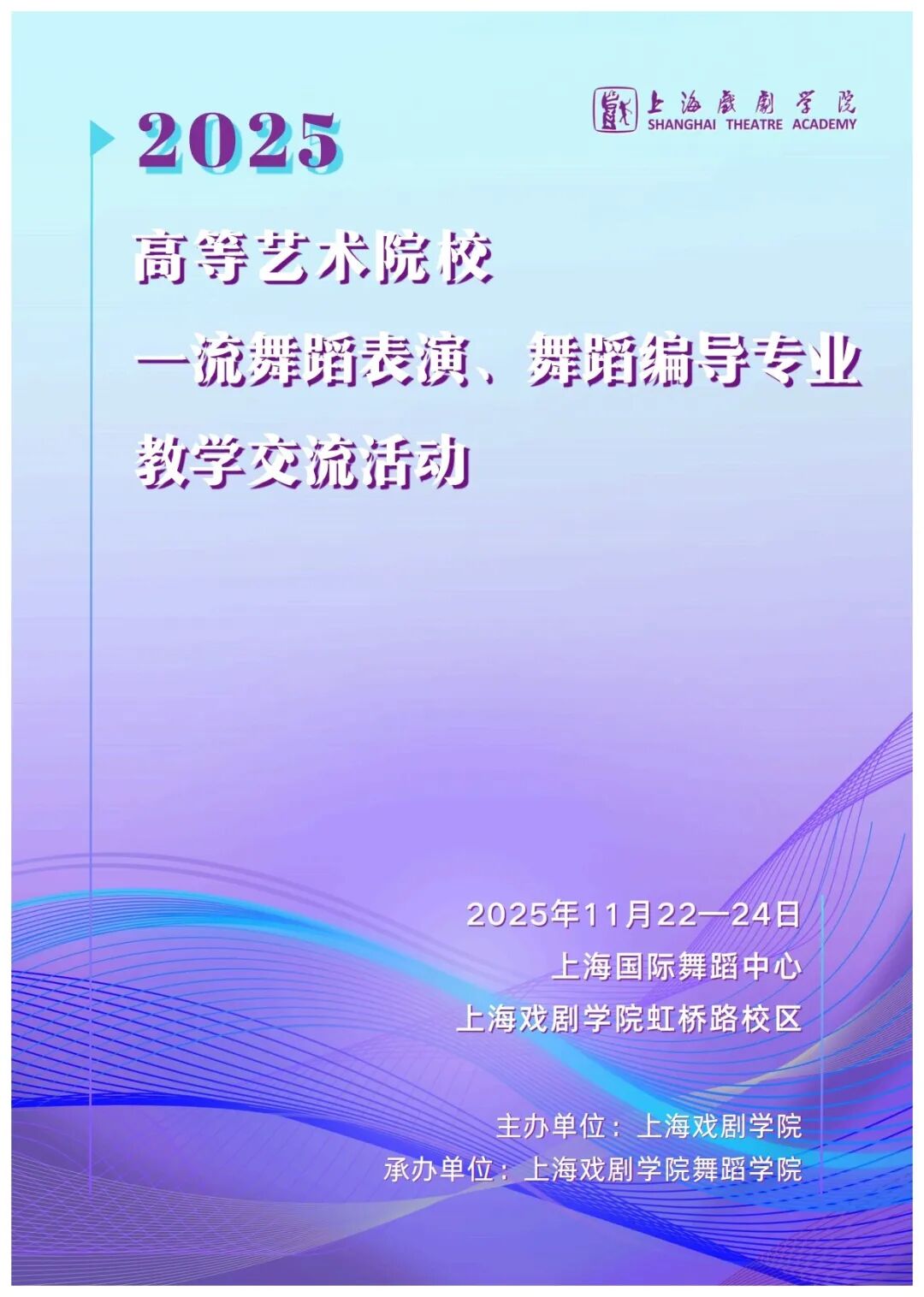 八秩华章共庆,金秋舞韵绵长。值此上海戏剧学院建校80周年之际,为深入贯彻国家文化强国战略,服务新时代艺术人才培养大局,进一步完善上戏“思政引领、专业融汇、科艺融合、产教融通”的舞蹈人才培养模式,构建特色鲜明的高质量专业人才培养体系,我校将于2025年11月22—24日在上海国际舞蹈中心举办“2025高等艺术院校一流舞蹈表演、舞蹈编导专业教学交流活动”。诚邀舞蹈教育家、艺术家及各兄弟院校代表拨冗莅临,同研教学,共促发展,携手谱写中国高等艺术教育的时代新篇。